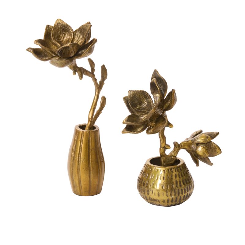 Create long-lasting spring or Easter displays on a console, centerpiece, or styled shelves with the antique gold cast aluminum Butterfly Magnolia Collection. Set in textured vases, these butterfly magnolia flowers will stay in bloom all year around & provide a decorative, artful backdrop for the home.