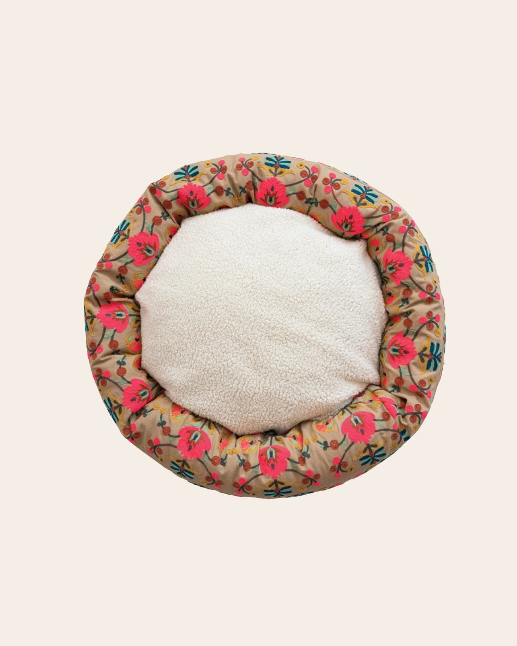 This round pet bed is a luxurious addition to any home, featuring a charming floral pattern on the top and a sherpa fabric on the bottom in natural, blue, and grey colors. Made of cotton and polyester, it's soft, durable, and easy to wash. It also comes with a removable cover for convenience. This bed is suitable for various spaces, bringing a touch of farmhouse, bohemian, French country, lodge, or cabin style to any home. It's perfect for providing a comfortable and warm space for pets. Provide furry friends with the comfort and support they deserve with the wide selection of cozy and durable pet beds.
