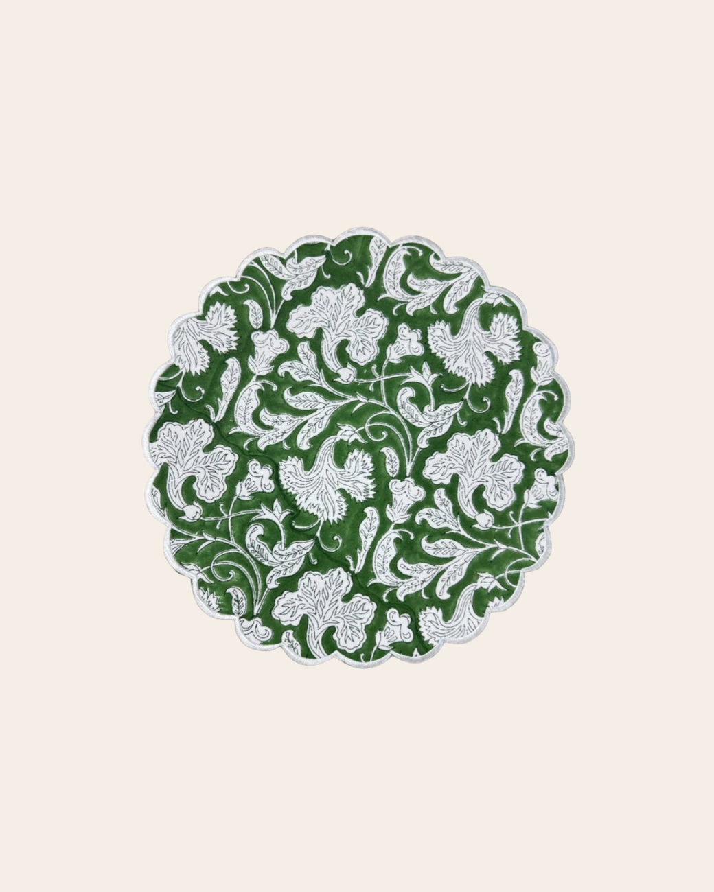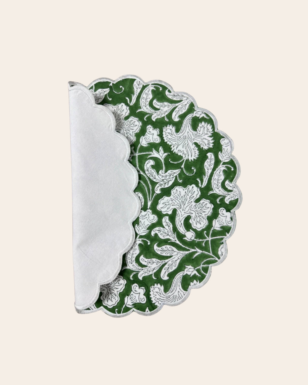 15" ROUND - 100% preshrunk cotton placemats have a lining at the back and a beautiful scalloped embroidery edge on all sides.