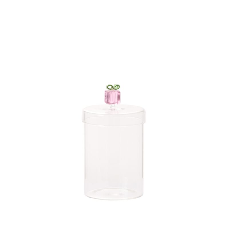 Display holiday treats in the Gifty Glass Canister, a clear cylinder-shaped storage container with a pink and green glass giftbox featured on the lid. This lightweight borosilicate glass vessel is whimsical and functional, perfect for storing colorful candies and trinkets on the kitchen counter. Style both sizes together for lots of storage and lots of holiday charm.