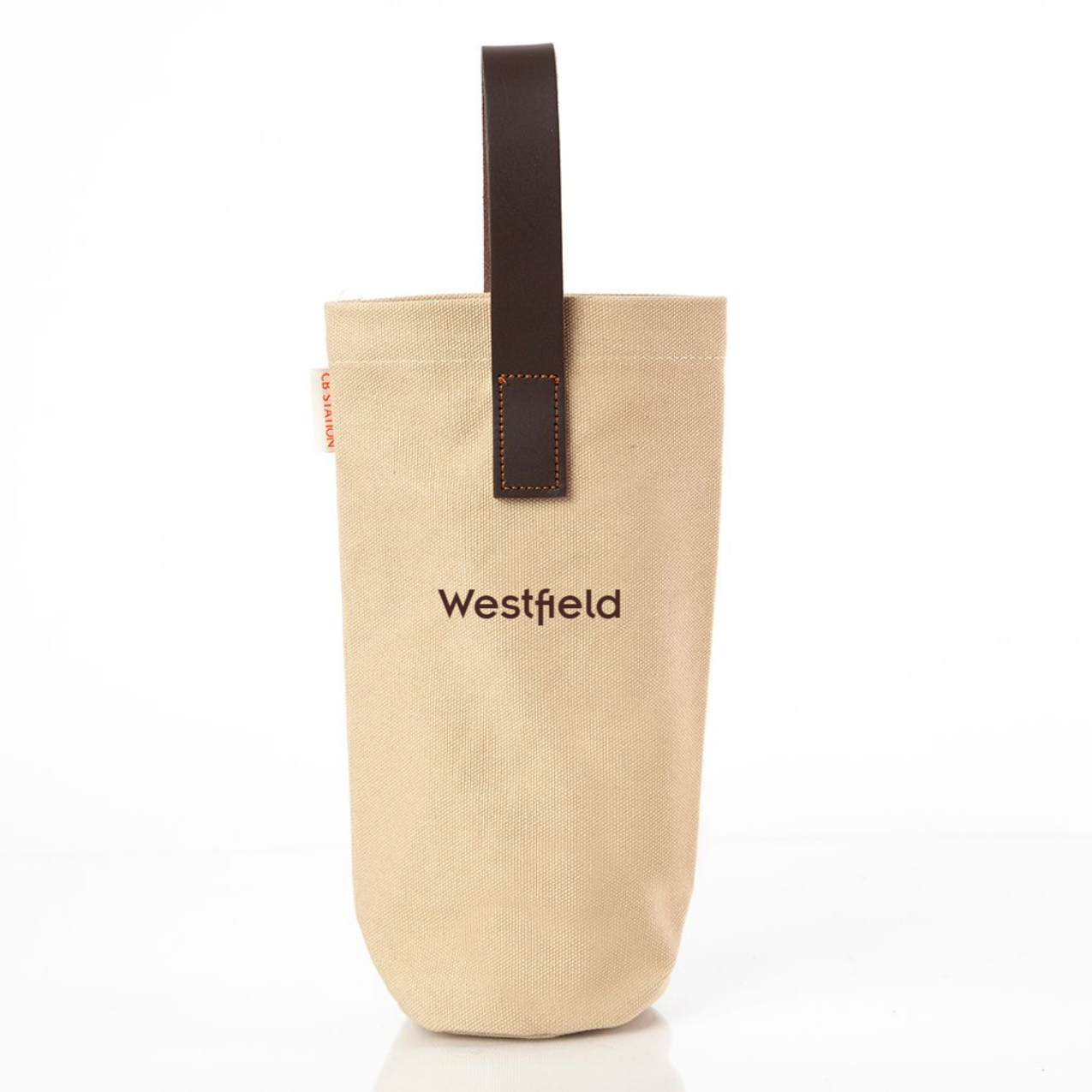 Leather Grip Wine Bottle Carrier with Westfield logo. Color, Safari