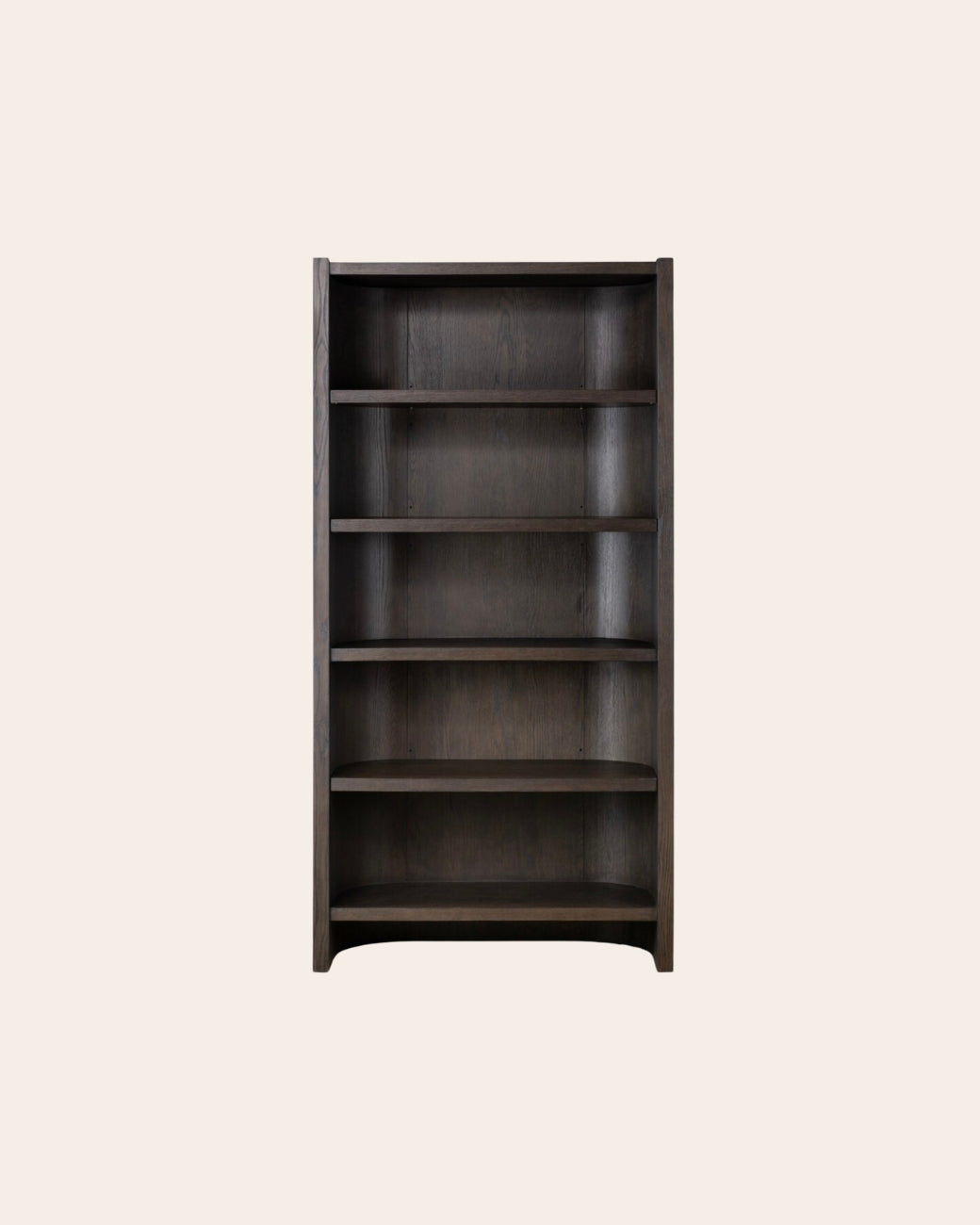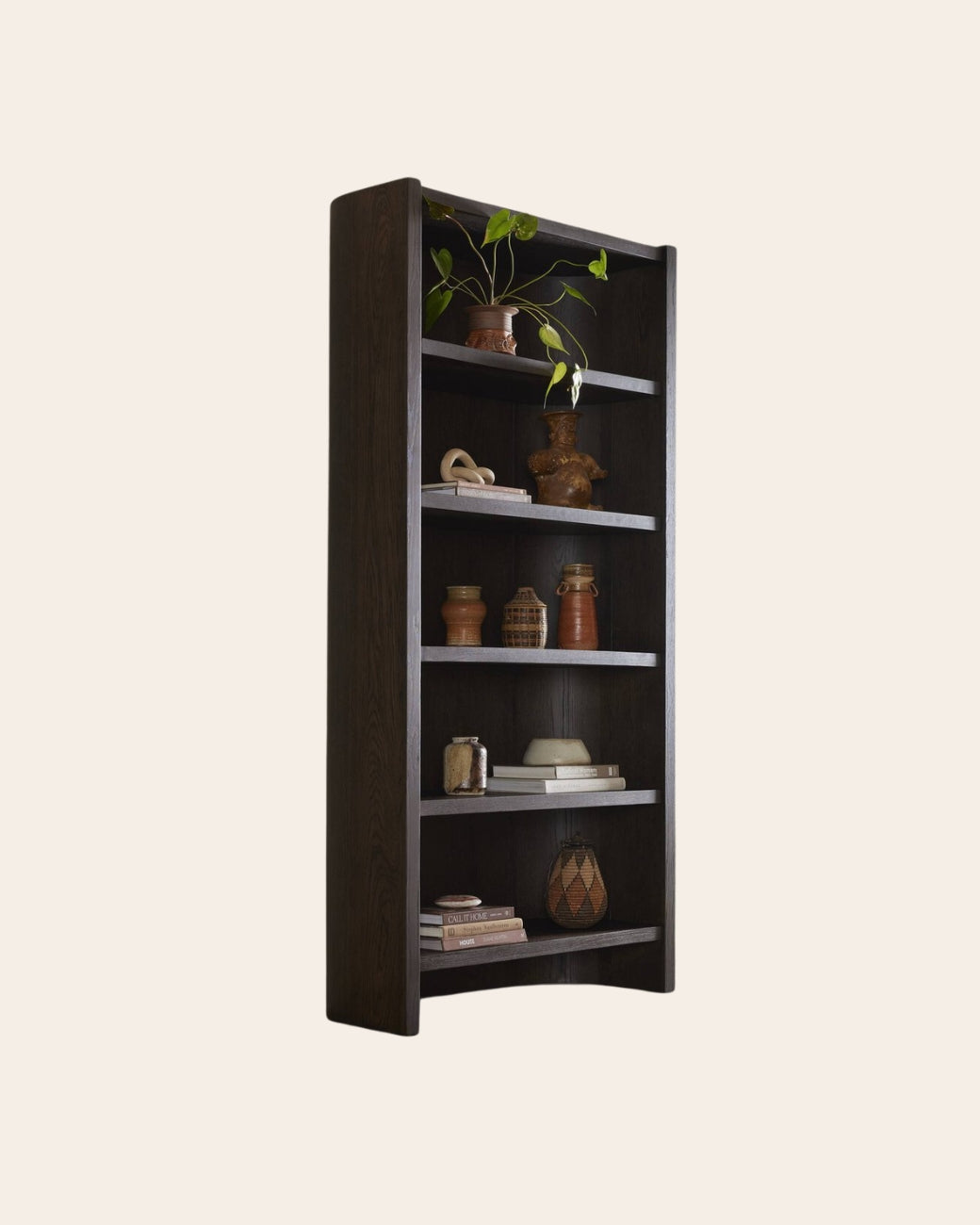 Rounded corners bring a refined touch to this transitional bookcase. A rubbed black finish reveals solid oak's brown undertones, giving the silhouette a nod to heritage style.