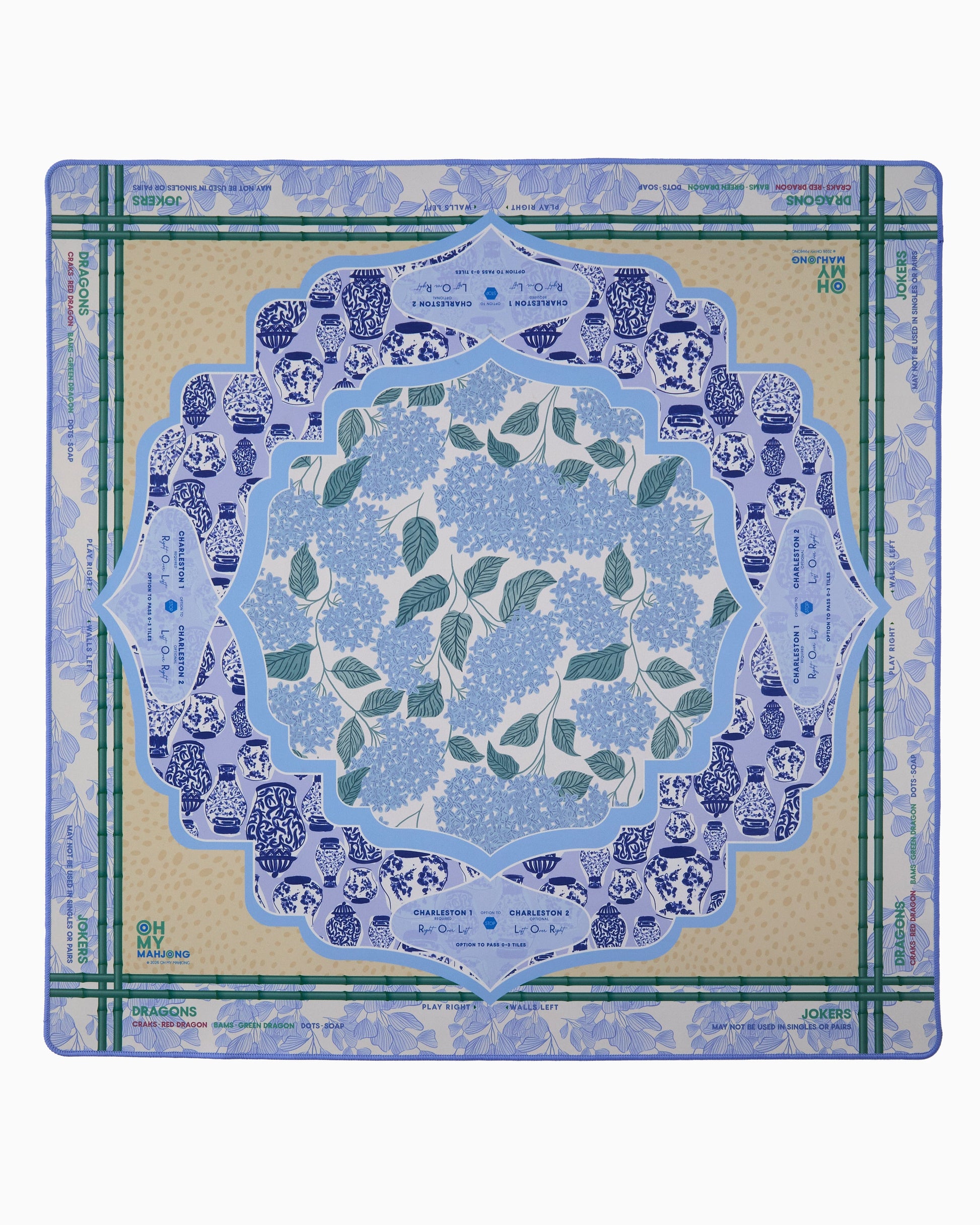 Introducing the Luna Mat — a serene yet statement-making addition to your Mahjong setup, designed for those who love timeless elegance with an artful twist. Awash in calming shades of blue and green, this mat beautifully blends hydrangea blooms, classic ginger jars, and a subtle antelope print for a look that’s equal parts coastal chic and heritage inspired. It’s sophisticated, layered, and quietly luxurious — the kind of pattern that feels right at home in your garden room, beach house, or candlelit game night setting.