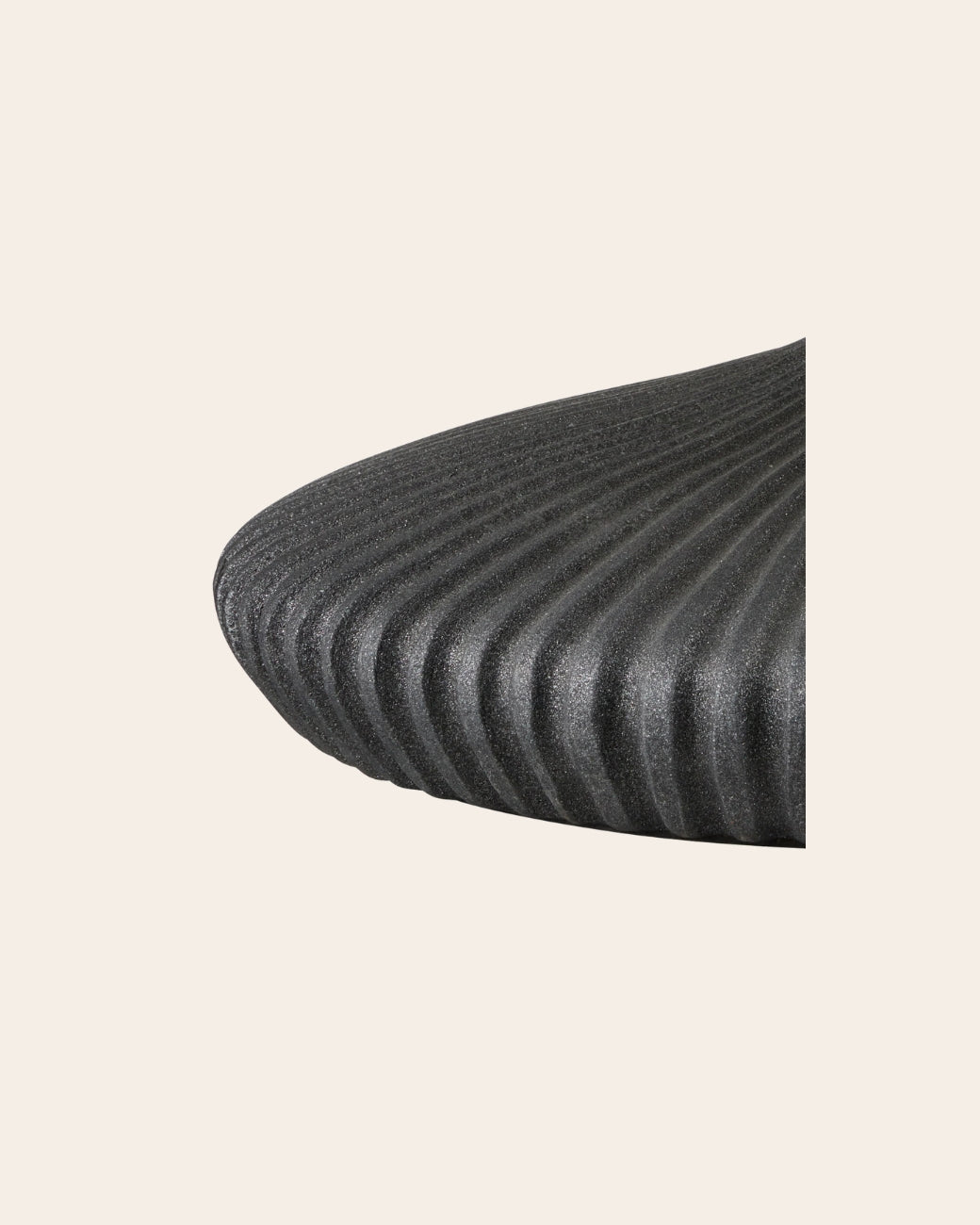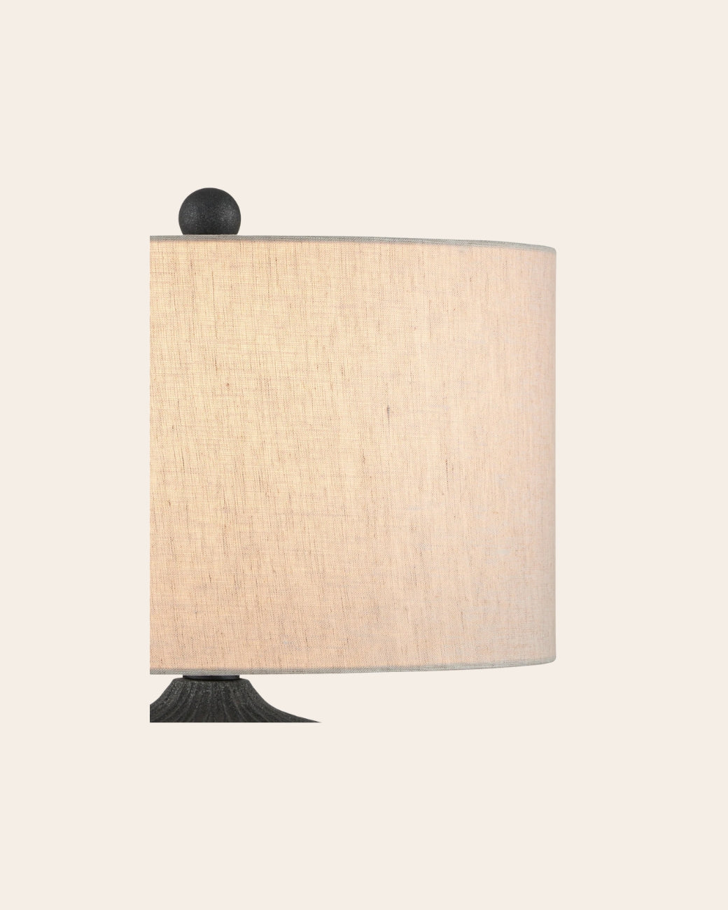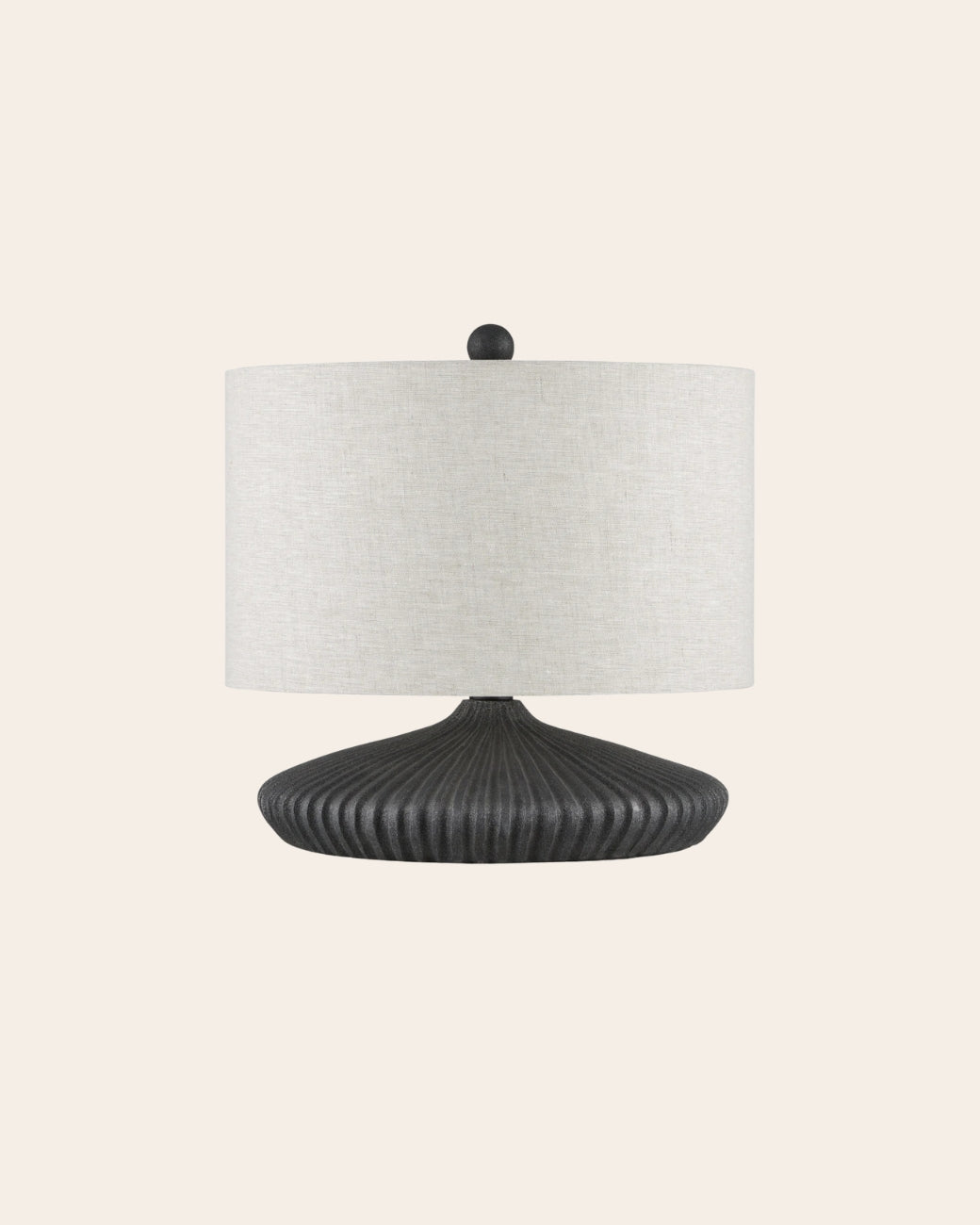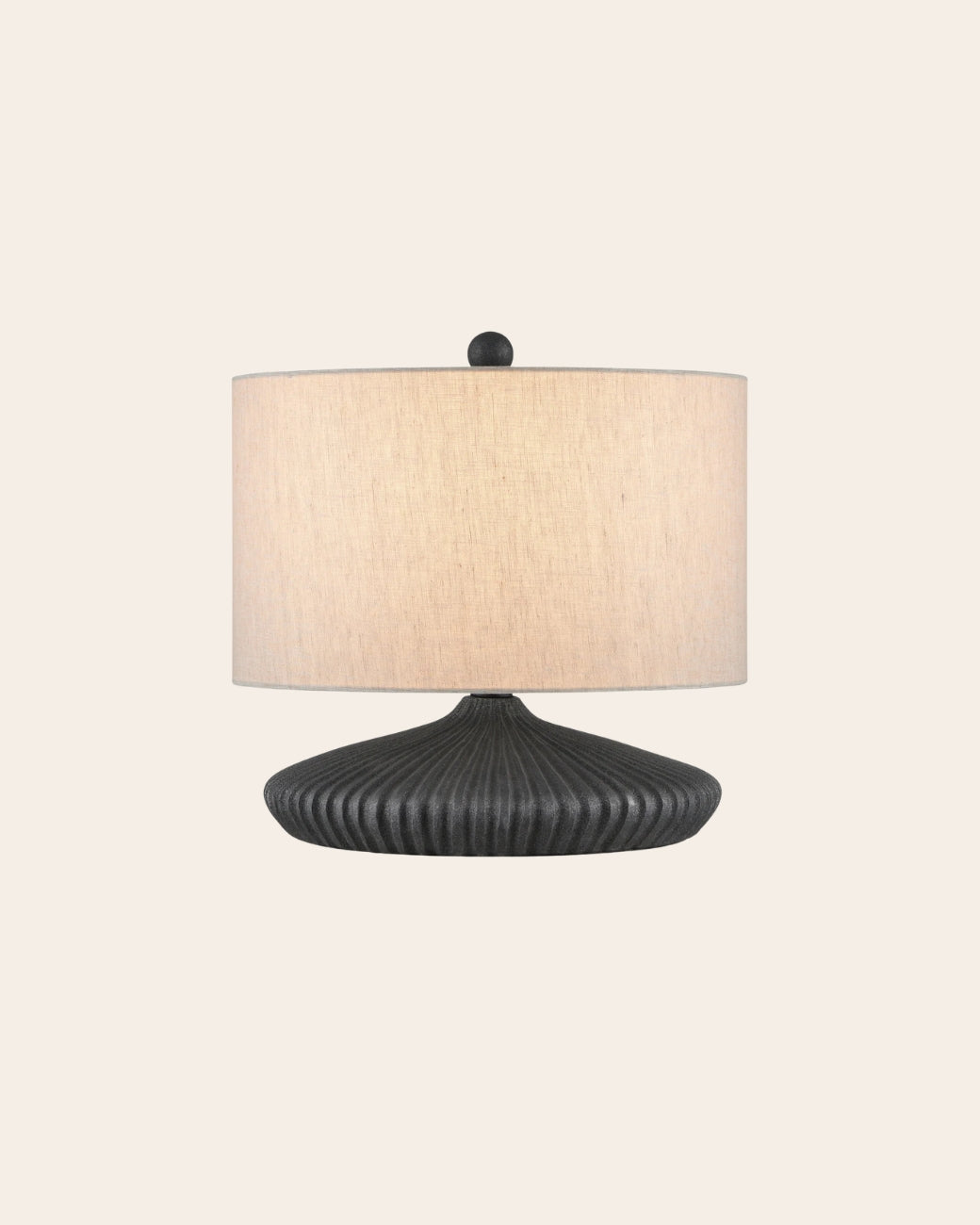 The Mythmaker Table Lamp lives up to its name, as its squashed circular body is made of terracotta in a mix of satin black and black granite finishes that make it look as if it has been forged of iron. Though there is a slight aged feel that brings the lamp added texture, it is still modern in its lines. The oversized shade paired with the flatness of the body is a stylish design detail, as is the matching finial that fastens the shade to the lamp.