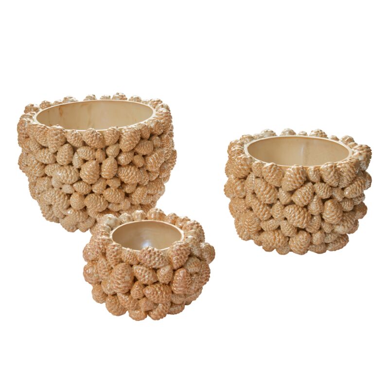 The Pine Gold Pot Collection adds a touch of nature-inspired elegance to your holiday decor or year-round displays. These dimensional ceramic pots, available in three sizes, feature hand-applied pinecones of varying sizes with a slightly opalescent finish over a warm cream base. Perfect for drop-in trees, branchy arrangements, or plants, these neutral pots seamlessly blend with any home decor style.