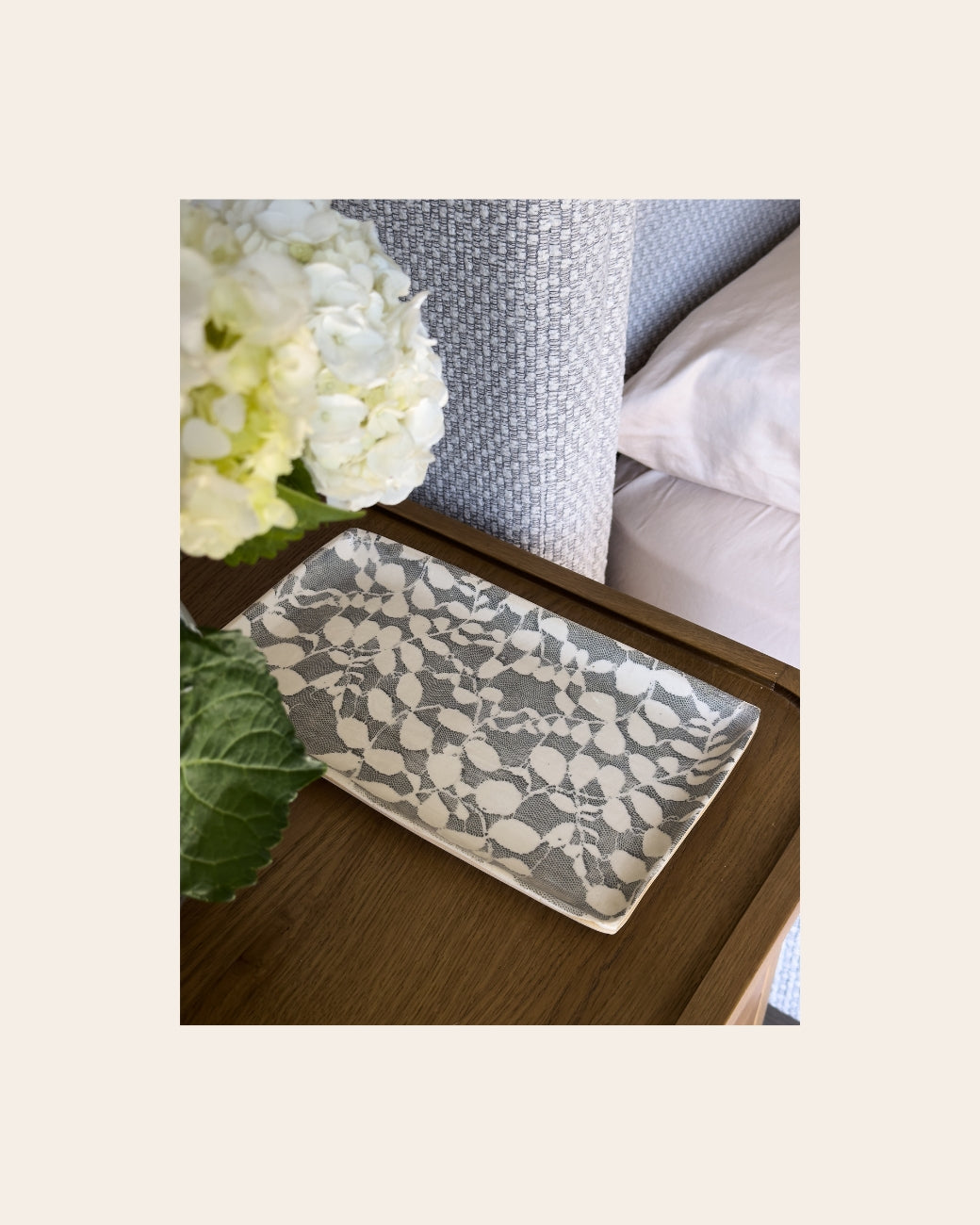 Patterns are created by painting through textiles and lace using liquid porcelain to produce a distinctive "one of a kind" result.