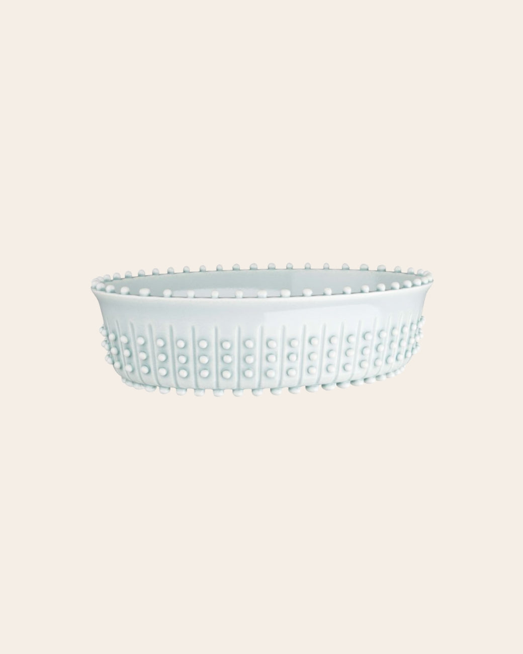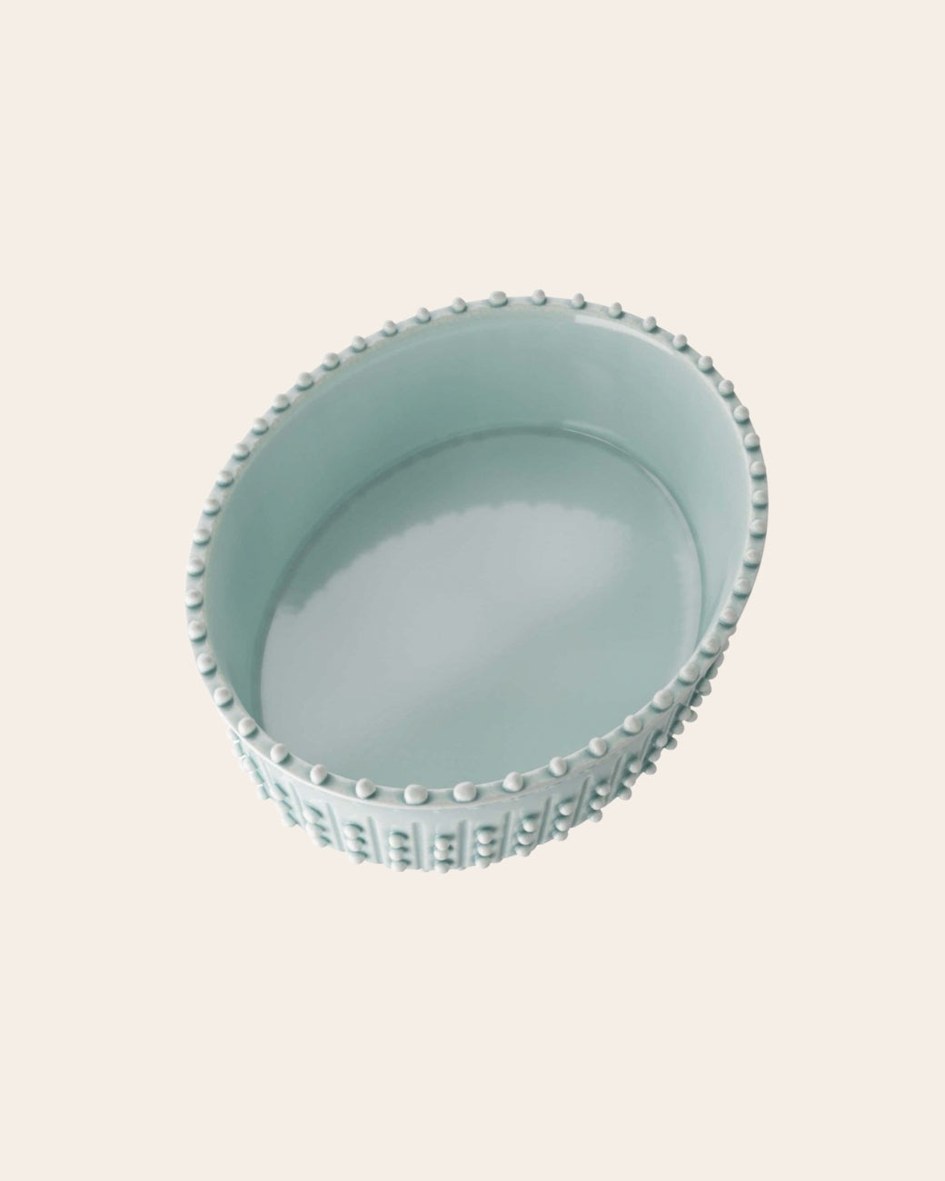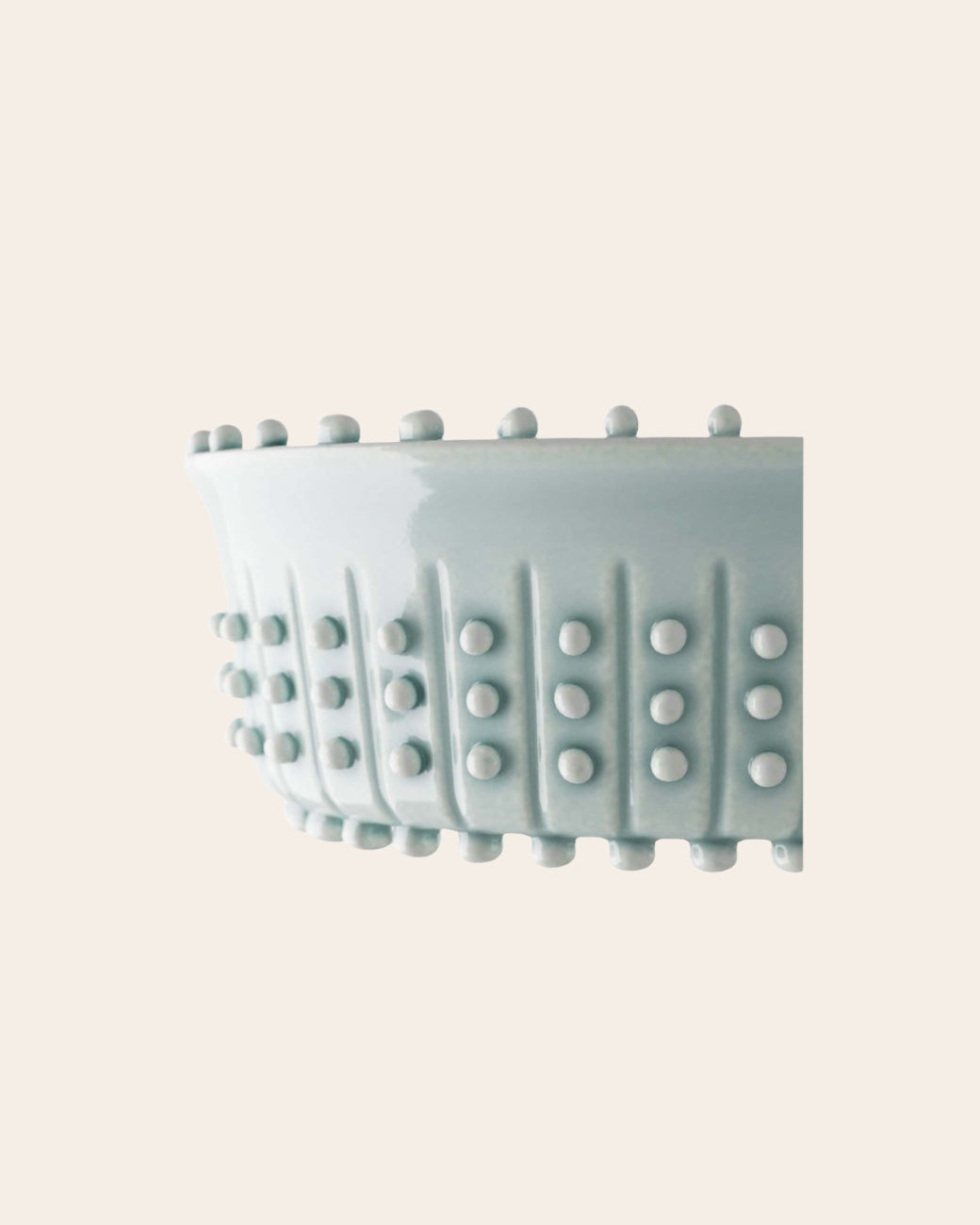 A ceramic centerpiece in a celadon finish, doused in soft hand-applied beads for a unique design. Finish will vary.