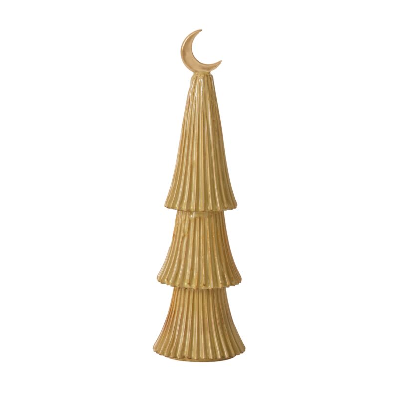 Make holiday memories by creating a winter wonderland with the Village Tree, a charmingly artful ceramic tree that features a stacked design, each layer detailed with vertical ridging. Topped with a delicate crescent moon, this hand painted tree is a beautiful shade of soft ochre, and hints of natural bisque peek out at the edges of the tree. Style with the other Village Collection trees and houses for a layered holiday display.